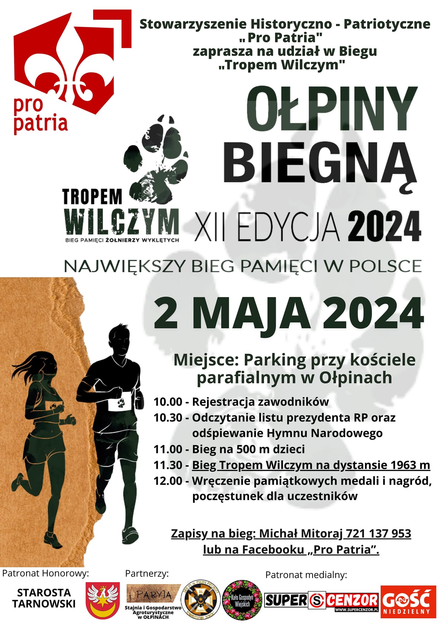 2 maja Stowarzyszenie „Pro Patria” serdecznie zaprasza wszystkich zainteresowanych do udziału w XII edycji Ogólnopolskiego Biegu Tropem Wilczym. Bieg organizowany jest w Ołpinach i co roku gromadzi zdecydowanie ponad 100 uczestników. Bieg związany jest z upamiętnieniem Żołnierzy Wyklętych walczących w obronie naszej Ojczyzny w latach 1945 – 1963.